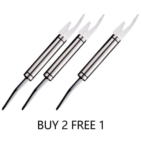 Double-row knife blade: two rows of knife blade a long and a short, the long one can be used to cut off the head of shrimp, divide the fish, pick out the shrimp thread and other work. The short one is used to work together with the long one, which can shave the belly of the fish; the double row of blades can clean the fish scales more thoroughly.