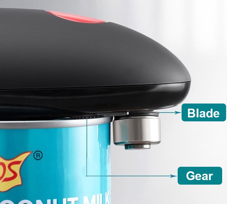 Two taps to open any cans with our electric can opener. Push the button to turn it on. It cuts cans 360° along the lid. Push the button again to stop.
