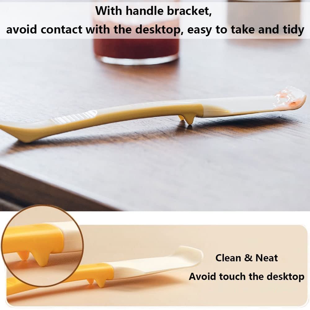Easy to Clean & Tidy Neat: This peanut butter spatula with a little holder in the end, that avoid touching the desktop while you put it on the countertop after baking or spreading jam. After finished, just let it rush under the water and wash with a little soap.