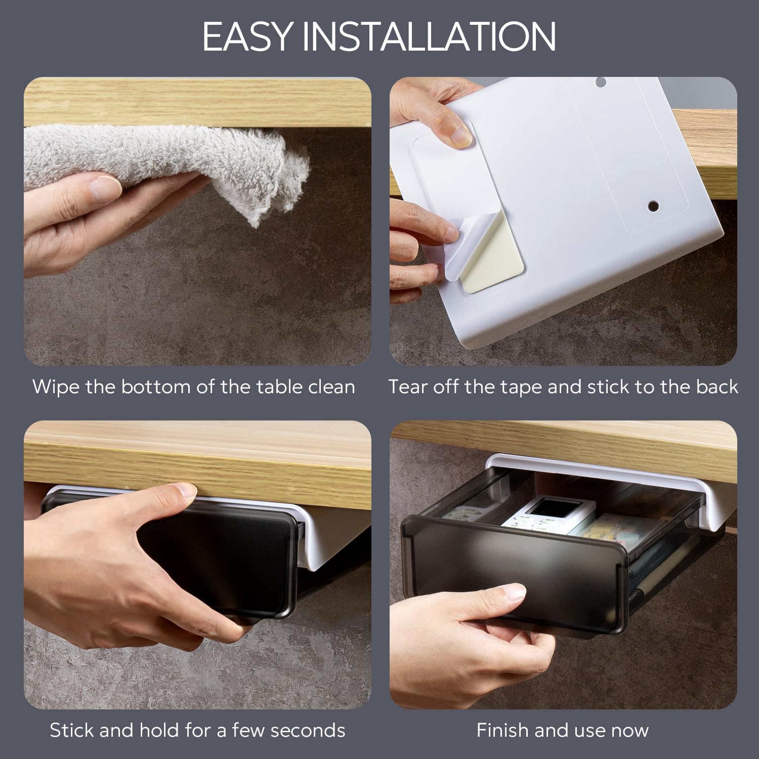 The under desk drawer storage organizer can hold up to 11lbs, it’s easy to mounted to clean surface tightly and will not drop off, can be used for years and years.