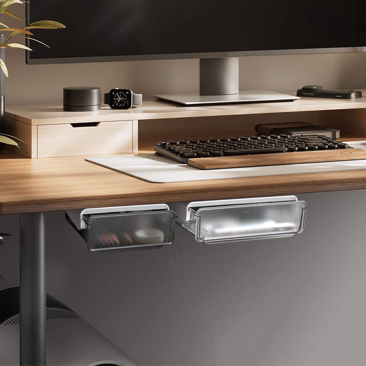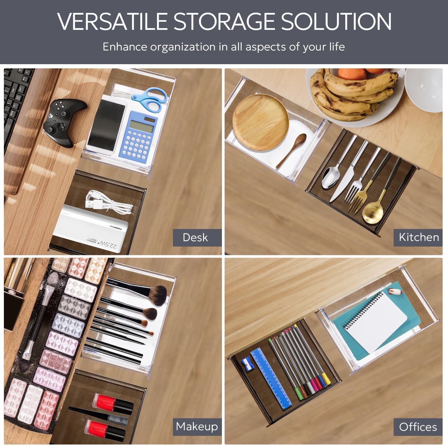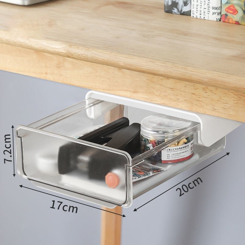 The adhesive under desk drawer can hidden under your desk, easy to keep your a varity of small items, such as phones, sticky notes, marker pen, pens, calculators, eraser, underwear and so on, upgrade your space.